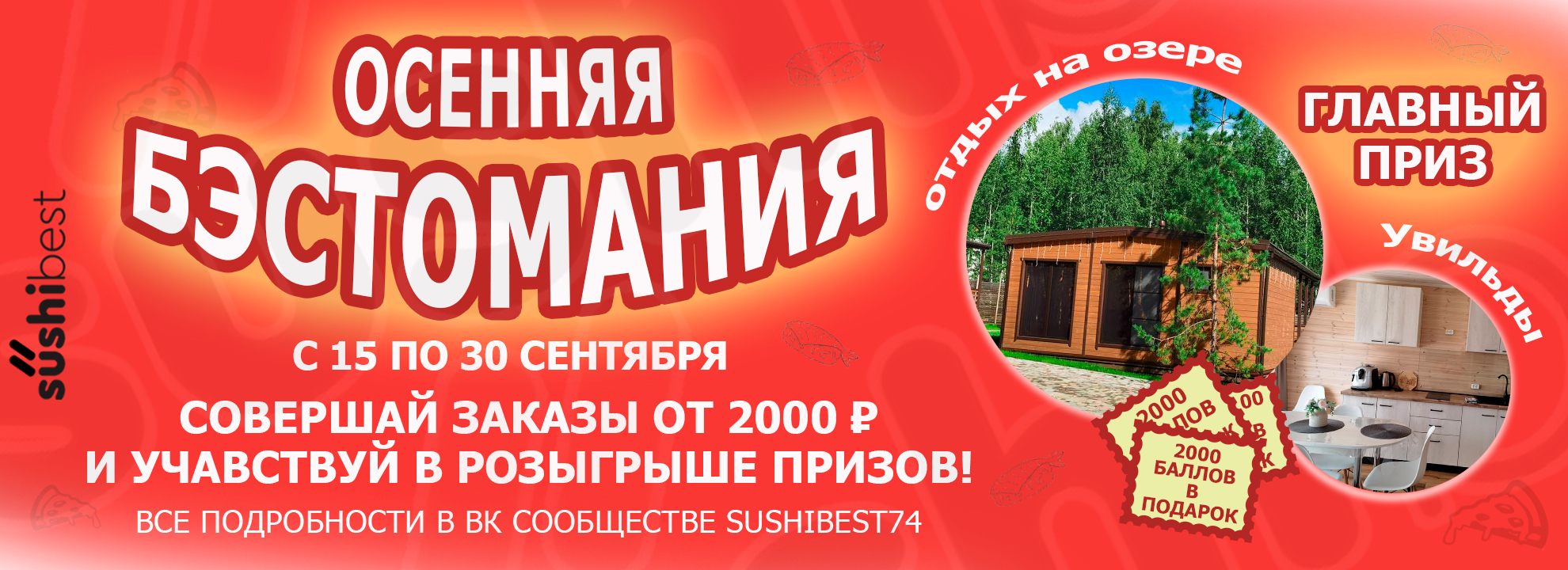 С 15 по 30 сентября участвуй в ОСЕННЕЙ БЭСТОМАНИИ и выиграй отдых на озере от компании "Мини рай Увильды". Совершай заказы от 2000 ₽ и прими участие в розыгрыше призов! 💫🎁
